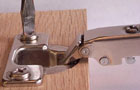 Next, it is time to place the mounting plates on the cabinet. An easy way to do this is to hold the door in place (in its fully opened position relative to the cabinet) and put two screws in each mounting plate on the cabinet side. Then separate the door and hinges from the hinge mounting plates and finish screwing the mounting plates onto the side of the cabinet.