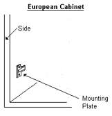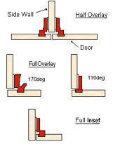 Now that the mounting plates have been firmly secured you can easily reattach the door to the cabinet box. Above was a description of how you would most commonly install a European hinge. Below are a few things that will help you fully understand what you are doing along with some hints if you plan on using European hinges on a face frame cabinet. When you are installing European hinges on a face frame cabinet, the mounting plate will be placed on the edge of the frame. However, it is easier and more conventional to use a one-piece European hinge like the one below. These illustrations should help you correctly determine whether your cabinet is frameless (European) or face frame. The other illustrations will show where and when to mount hinges as overlay, half overlay, and inset.